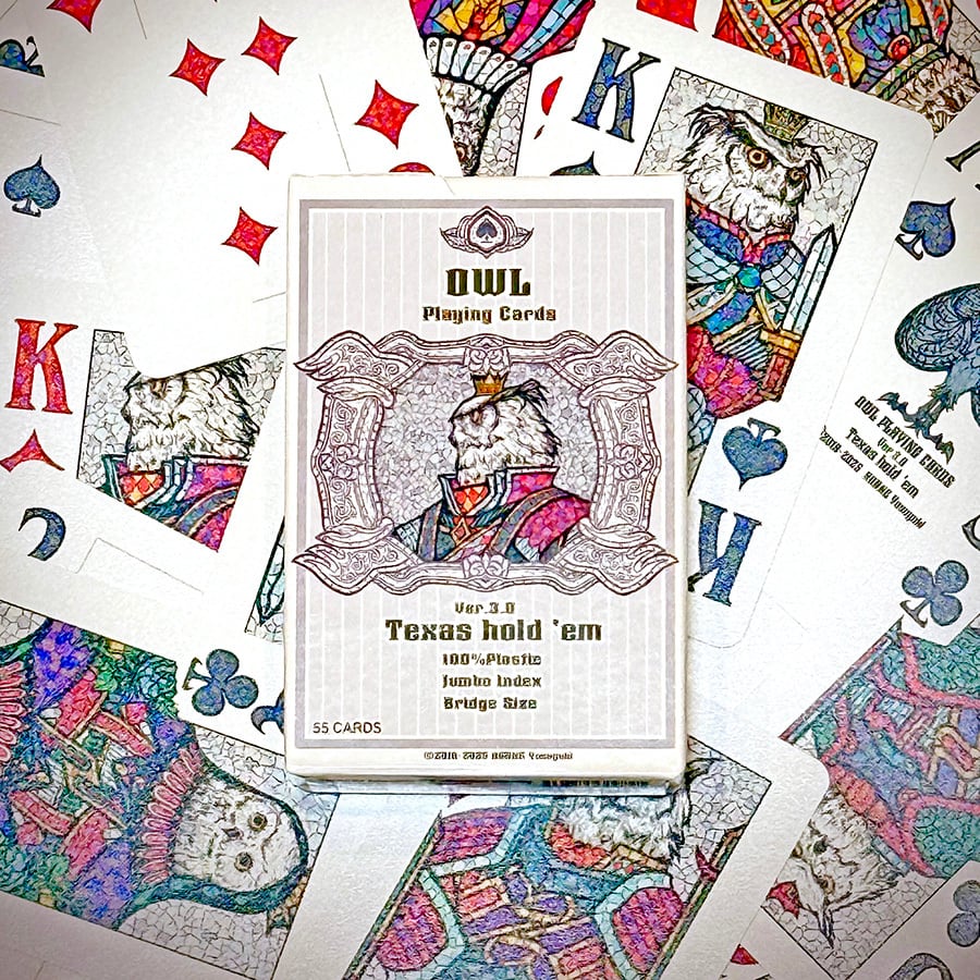初のプラスチック100%デックになります。紙製の高品質のデックを制作して行くスタンスは変えませんが、特にポーカープレイヤーの方々から、プラスチックを要望する声が多いのでOwlデックの三作目として制作を試みました。色んな偶然が重なりプラトランプ世界最高品質のCopagで作れる事になったのも要因の一つです。さすがにCopag製デックのカスタムは今回で最初で最後かもしれません。